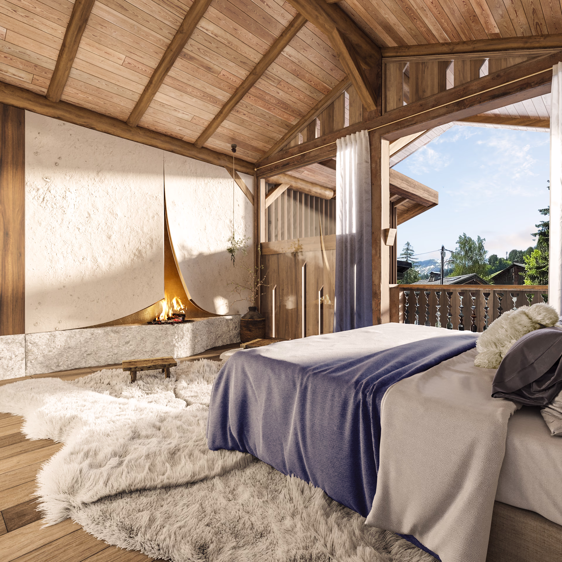 Les « loges », « retranchât » ou « Cortna » sont des terrasses couverte de type « loggia » que l’on trouvait sur certaines fermes et constructions traditionnelles du Val d’Arly. Ces terrasses servaient d’espaces de travail extérieurs à l’abri des intempéries et du vent. Elles se trouvent parfois de plain-pied et d’autres fois en étage. Enfin, la façade Ouest s’ouvre sur la ripisylve*, dans le but de révéler un peu plus depuis l’intérieur du chalet un élément fort du paysage.